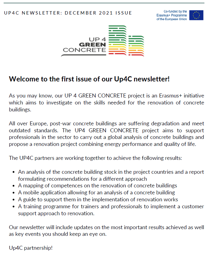Newsletter of the Erasmus+ strategic project Upskill Professional FOR Sustainable renovation plans of CONCRETE buildings