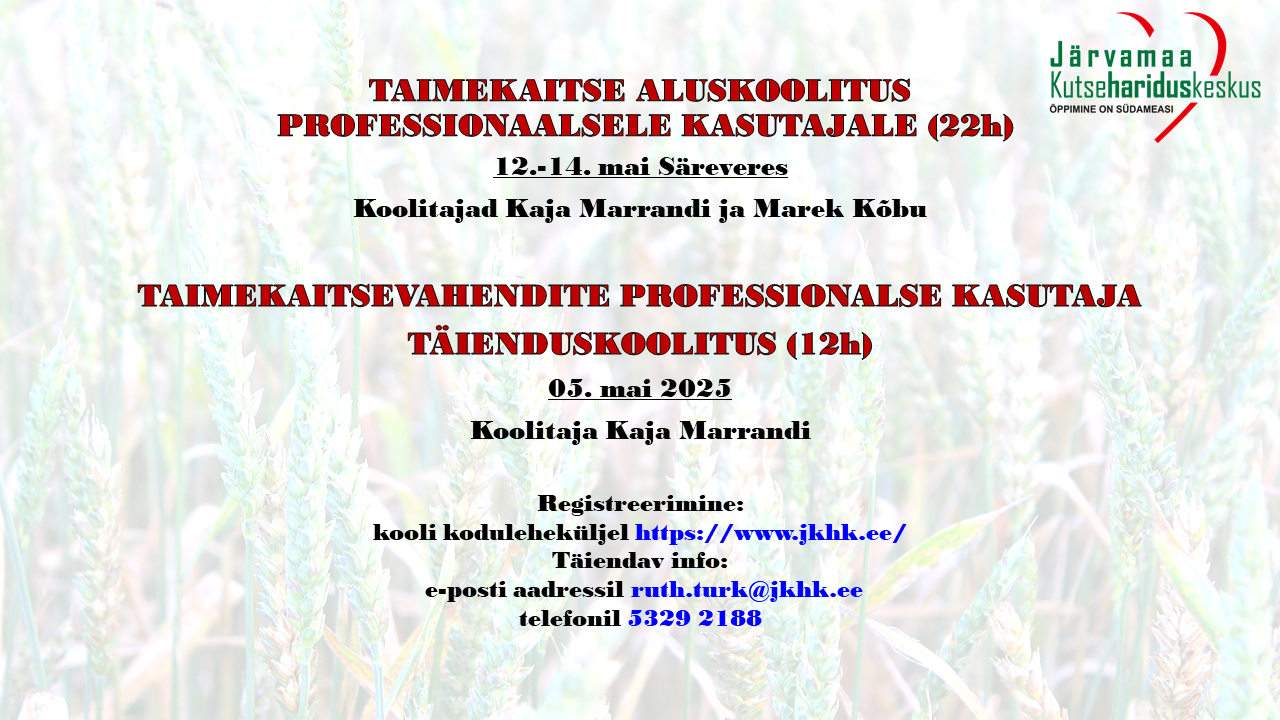 12.-14. mai toimub "TAIMEKAITSE ALUSKOOLITUS PROFESSIONAALSELE KASUTAJALE" (22 t) koolitus Järvamaa Kutsehariduskeskuse Särevere õppekohas.