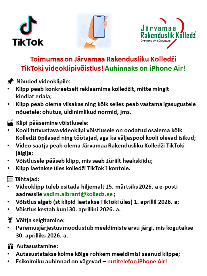 Kuulutame välja Järvamaa Rakendusliku Kolledži TikToki videoklipivõistluse!