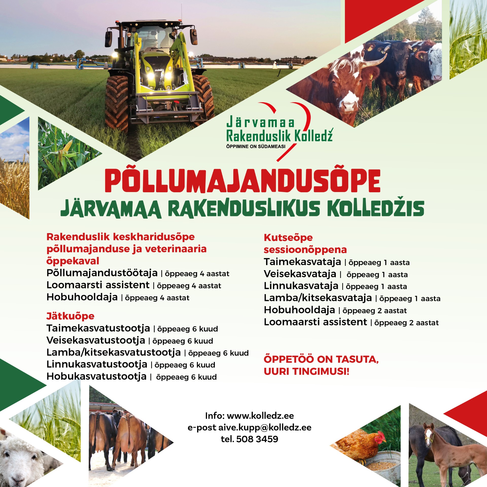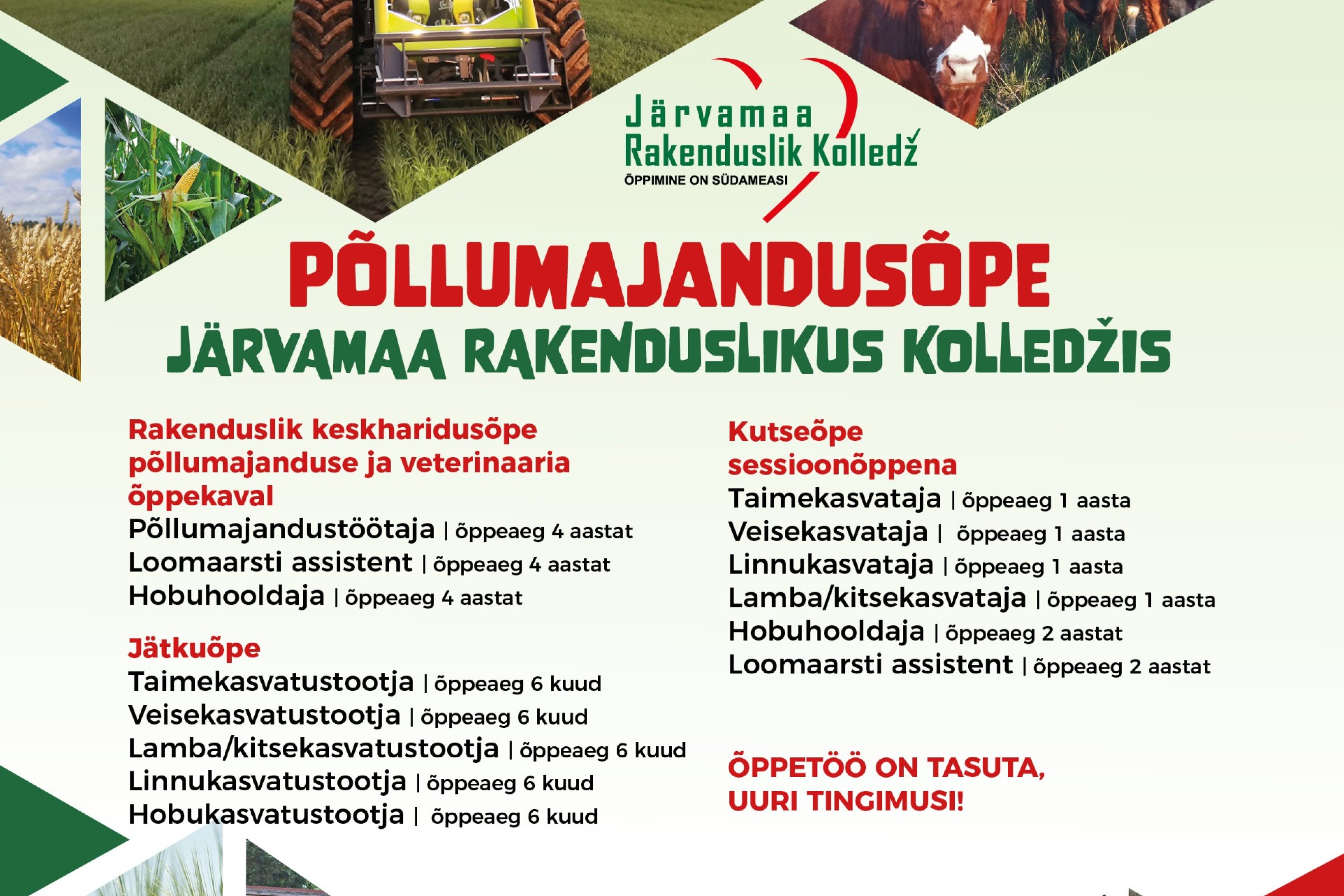 Tule õpi põllumajandust (taimekasvatus, loomakasvatus) Järvamaa Rakenduslikus Kolledžis!