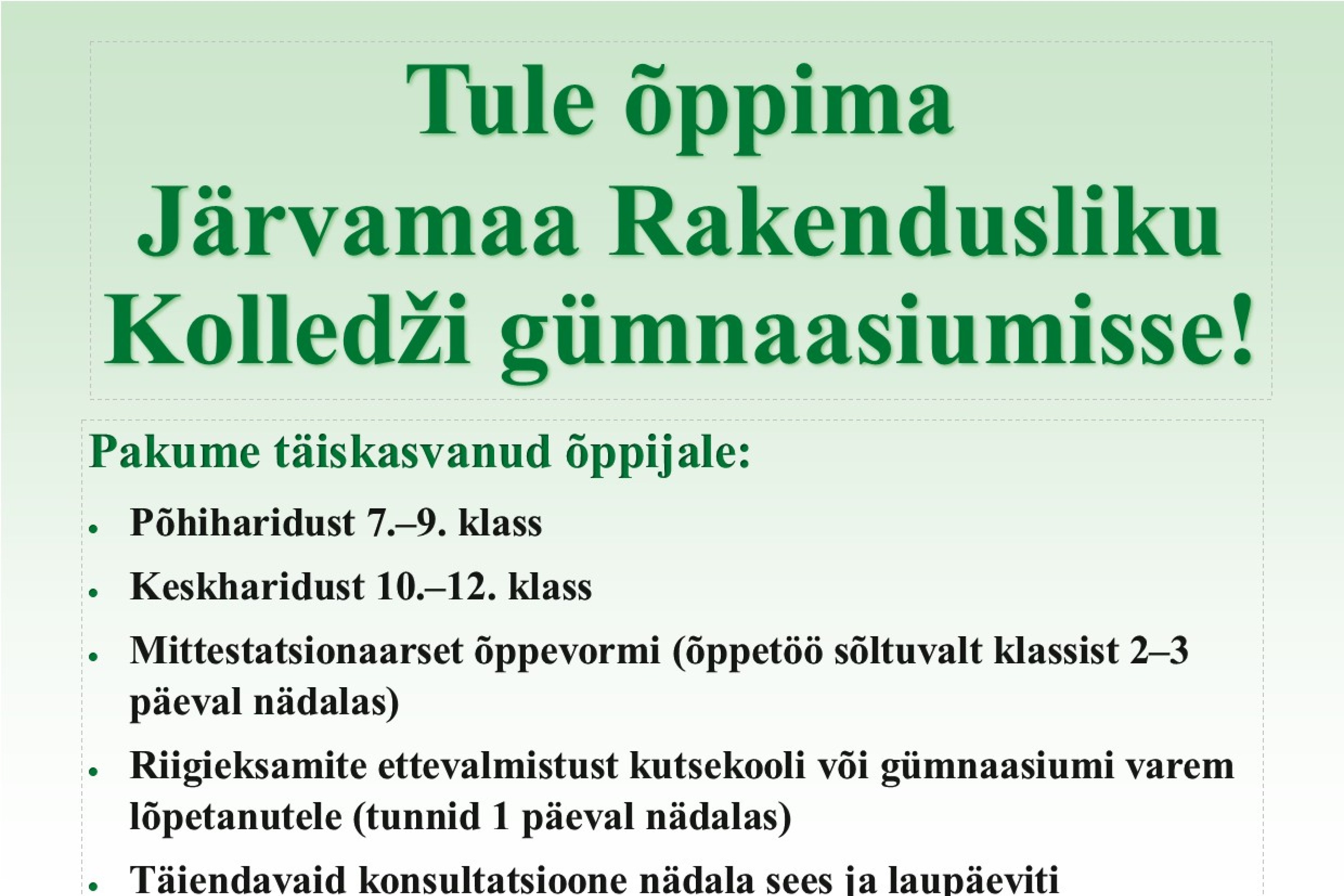 Tule õppima Järvamaa Rakendusliku Kolledži gümnaasiumisse.