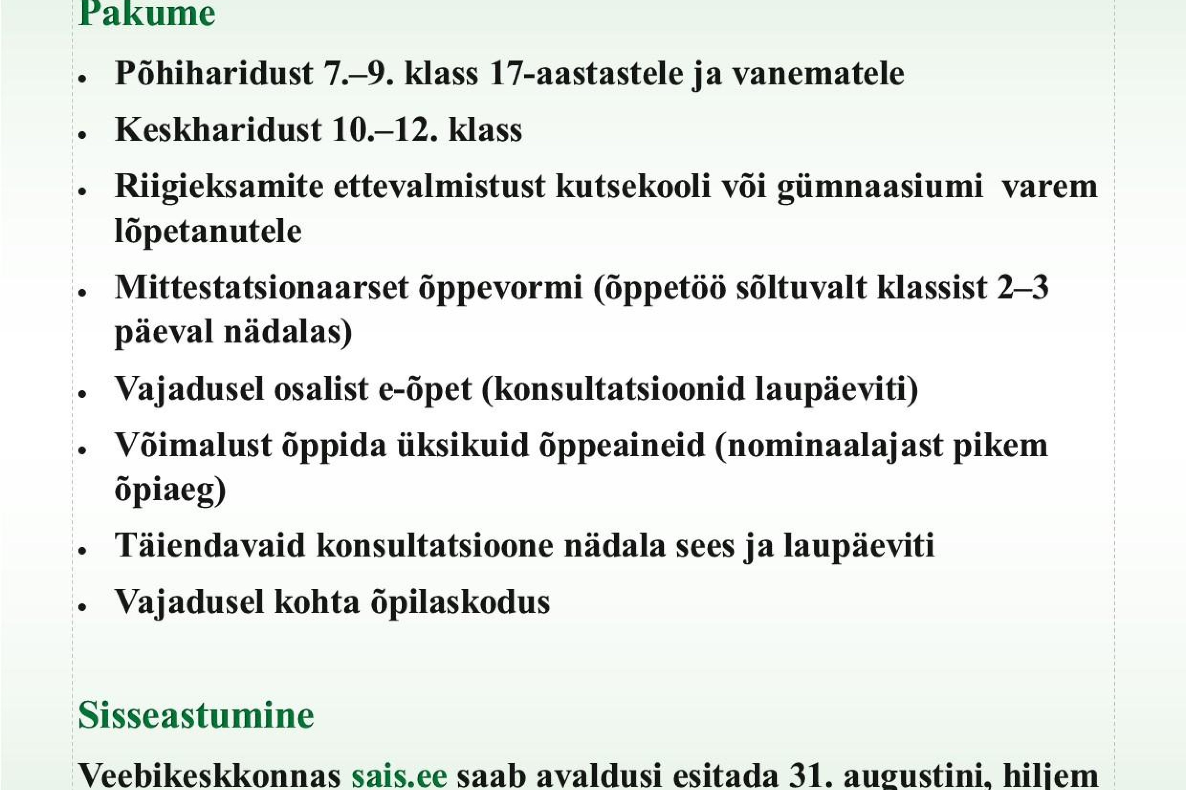 - Põhiharidust 7.–9. klass 17-aastastele ja vanematele