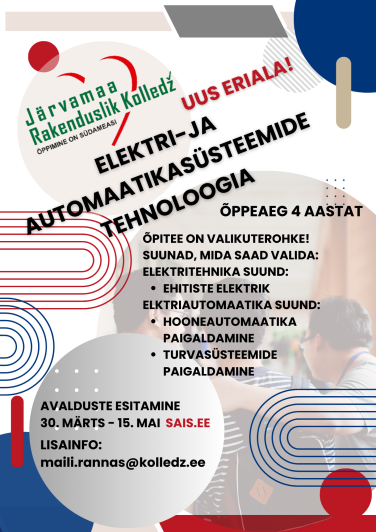 Täida kooli sisseastumisavaldus www.sais.eelink opens on new page. Otsi sealt õppekava ELEKTRI-JA AUTOMAATIKASÜSTEEMIDE TEHNOLOOGIA