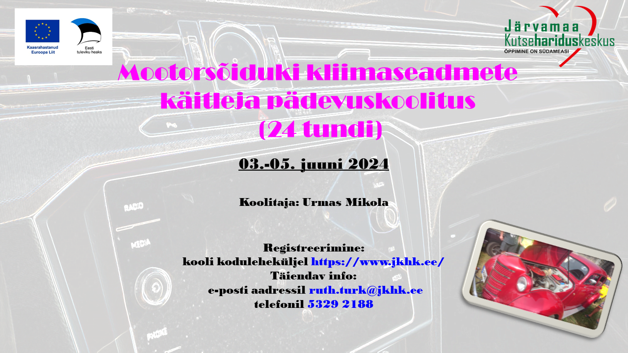 03. juuni 2024 algab Järvamaa Kutsehariduskeskuses Särevere õppekoha tehnikamajas kursus "Mootorsõiduki kliimaseadmete käitleja pädevuskoolitus".