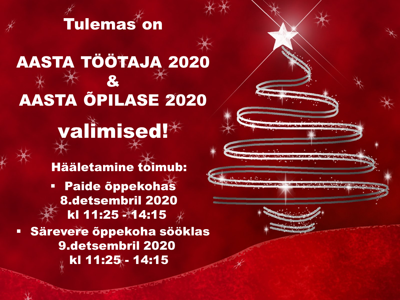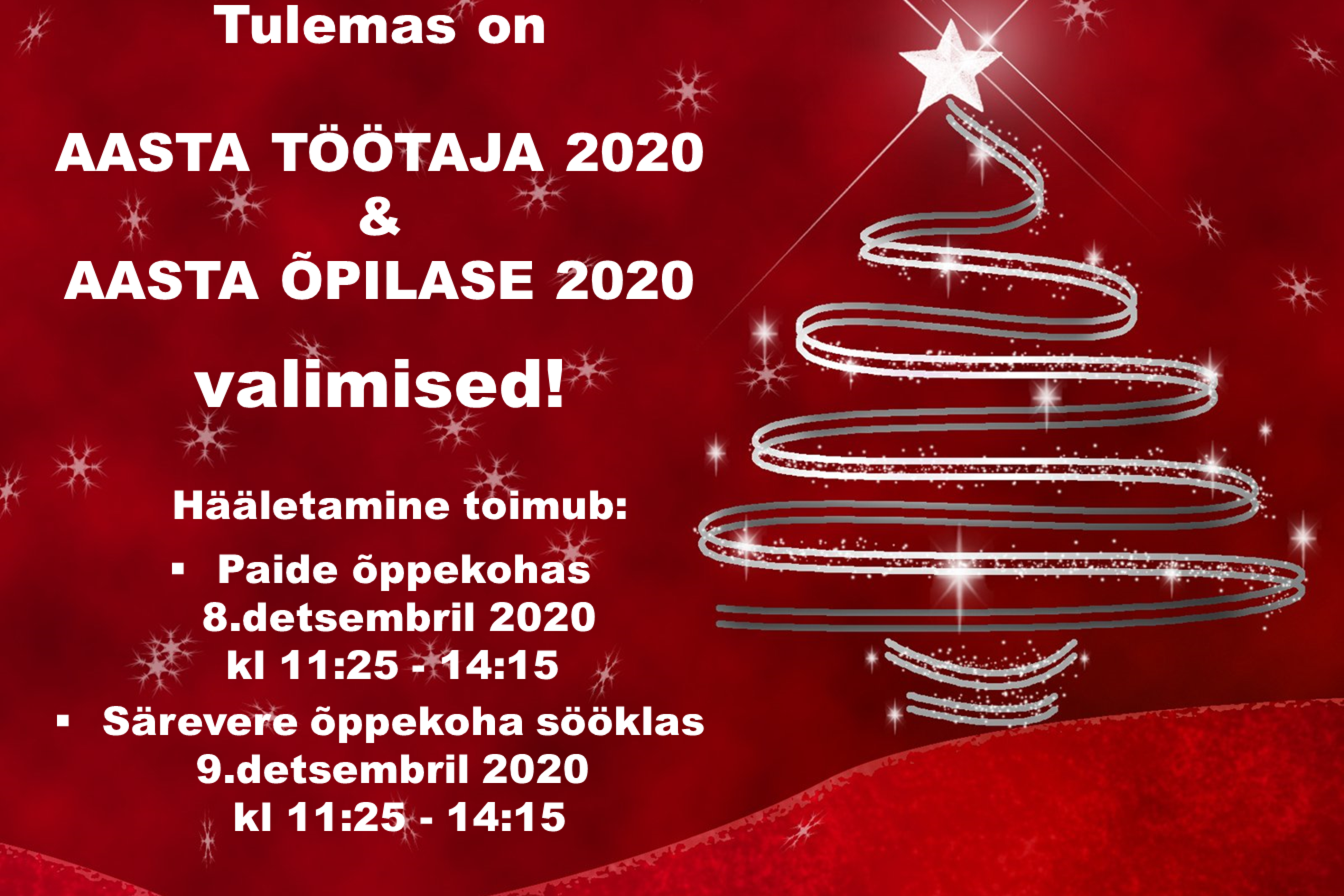 Aasta töötaja ja õpilase valimised toimuvad: Paide õppekoha C- ja B-korpuse vahekäigus 8.detsembril 2020 kell 11:25 - 14:15 Särevere õppekoha sööklas 9.detsembril 2020 kell 11:25 - 14:15 AASTA ÕPILANE 2020 nominentidega saab tutvuda SIIN AASTA TÖÖTAJA 2020 nominentidega saab tutvuda SIIN Ava foto aasta_opilane_2020_nomindendid.pdf Ava PDF-dokument aasta_tootaja_2020_nominendid.pdf Ava PDF-dokument Viimati muudetud 23.08.2021.