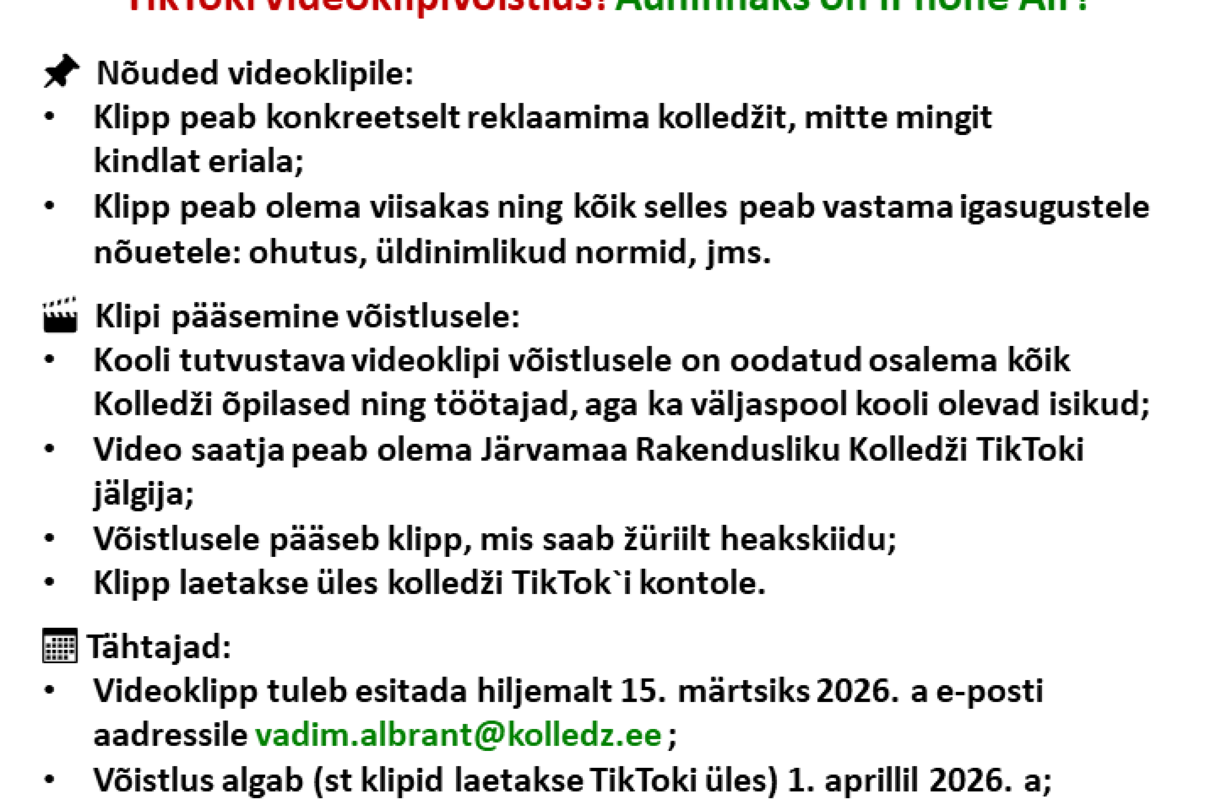 - Video saatja peab olema Järvamaa Rakendusliku Kolledži TikToki jälgija;