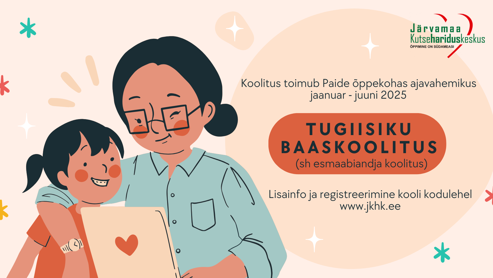 "Tugiisiku koolitus (sh esmaabiandja koolitus)" (260 t) algab 17. jaanuar 2025 Järvamaa Kutsehariduskeskuse Paide õppekohas (täpsema ajakava edastame kursusele registreerunutele).