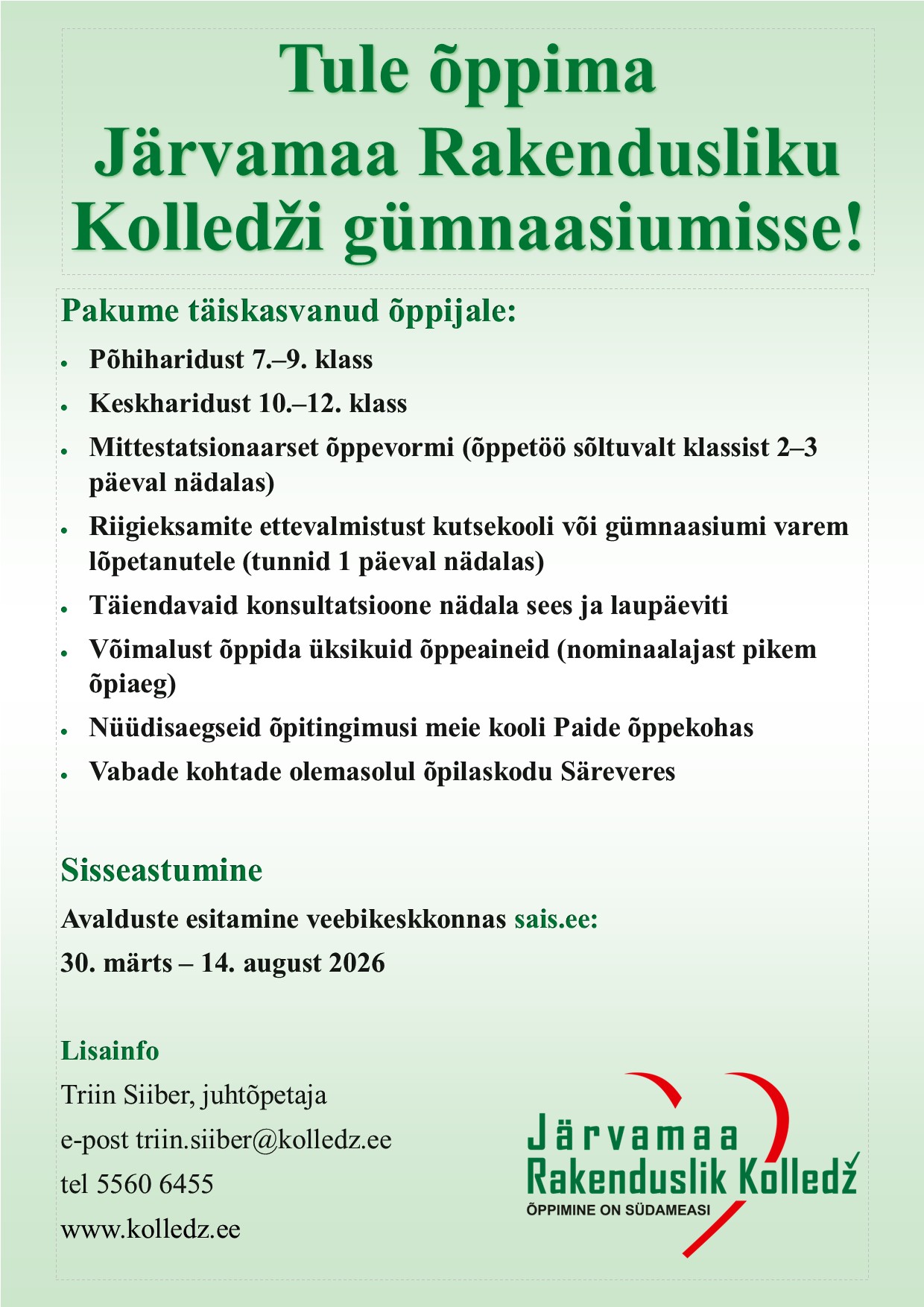 Tule õppima Järvamaa Rakendusliku Kolledži gümnaasiumisse.