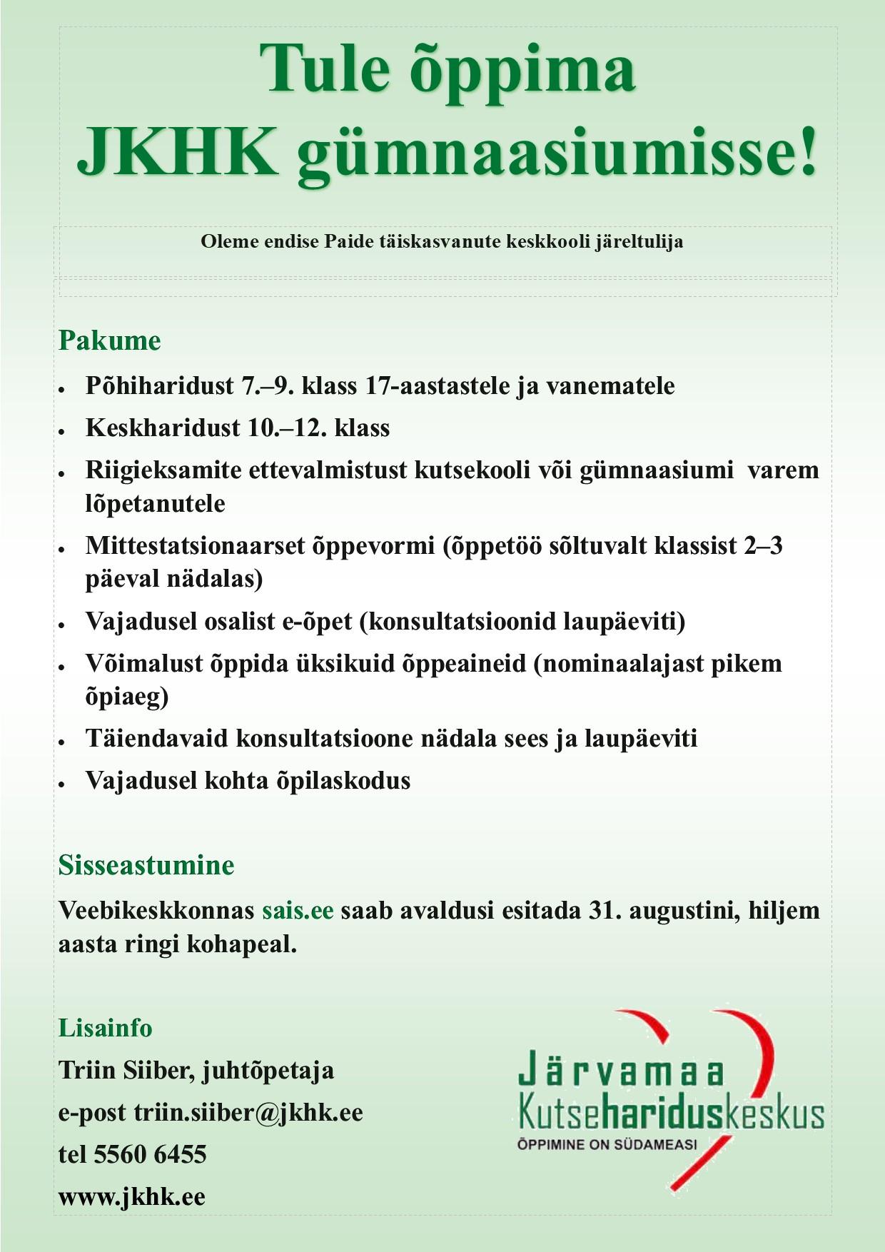 Järvamaa Kutsehariduskeskuse gümnaasium pakub: