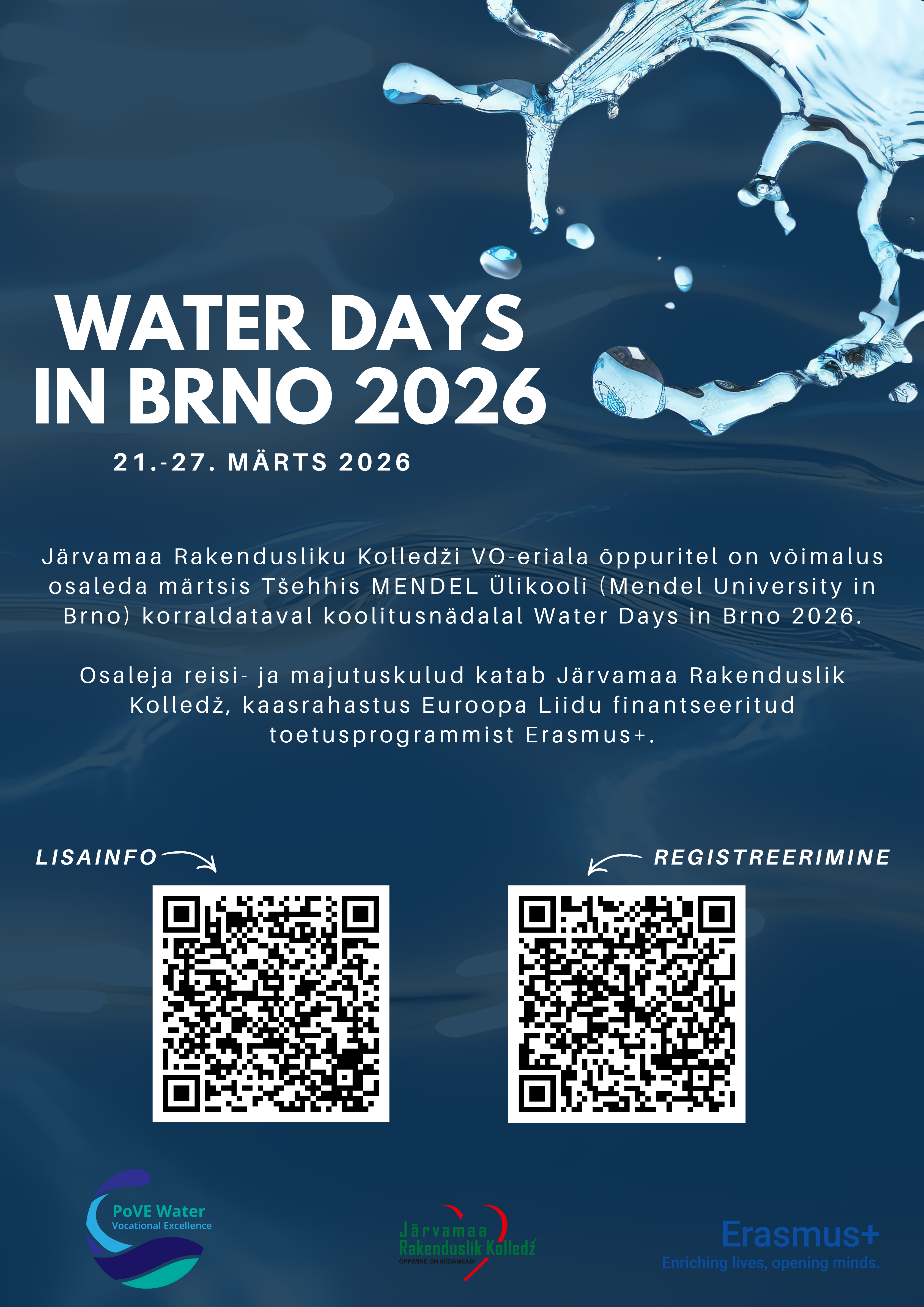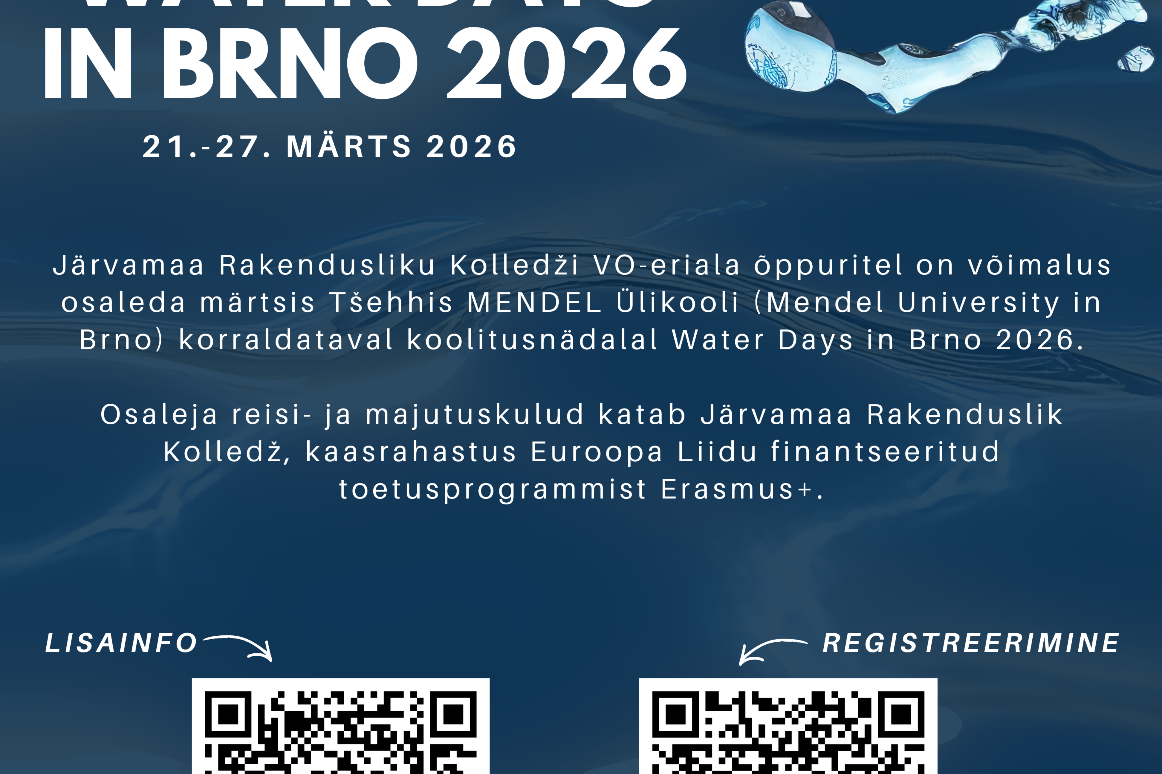 Järvamaa Rakendusliku Kolledži VO-eriala õppuritel on võimalus osaleda rahvusvahelisel koolitusnädalal Water Days in Brno 2026, mis toimub 21.–27. märtsil 2026 Mendeli Ülikoolis Brnos (Tšehhi).